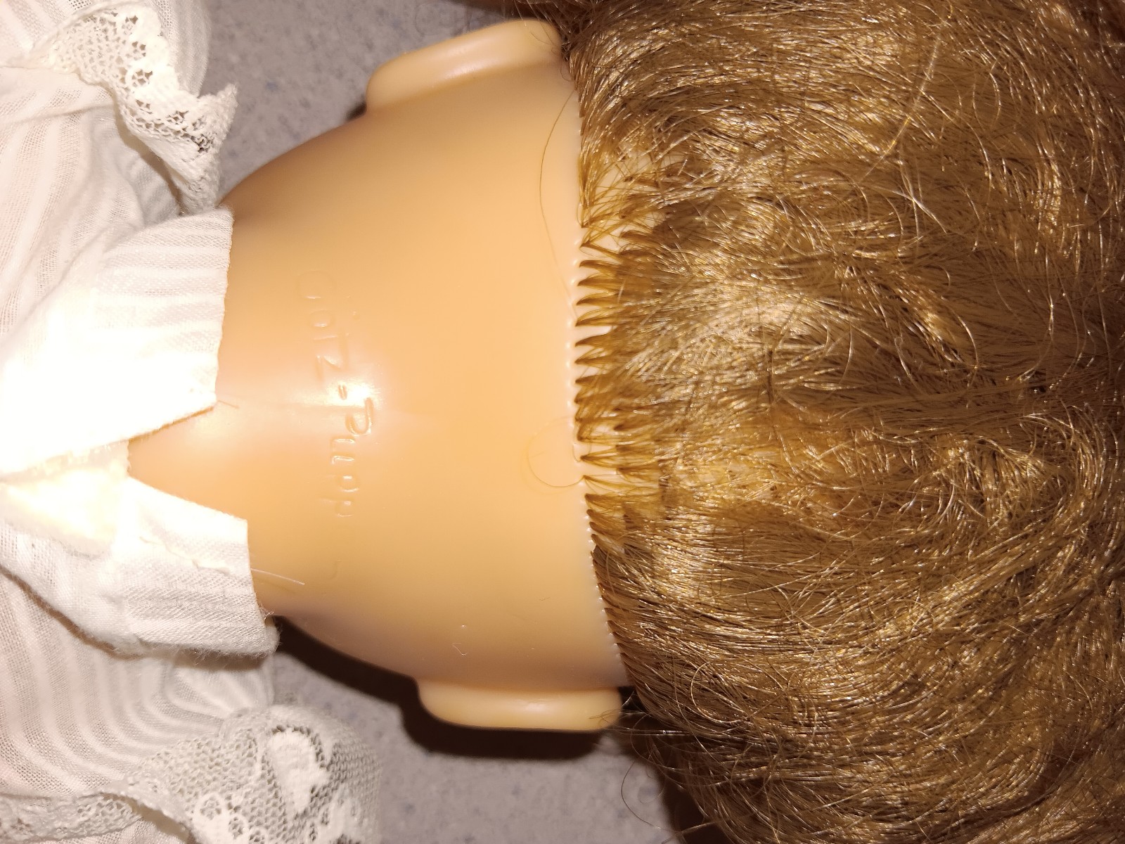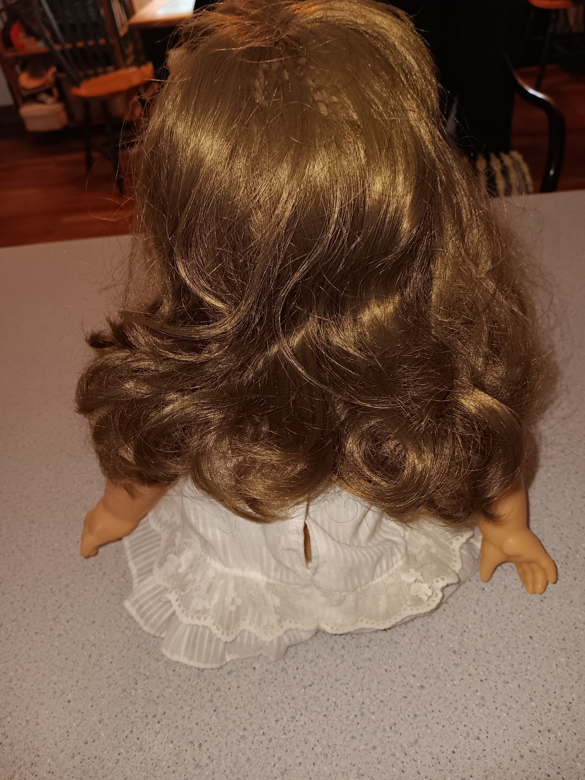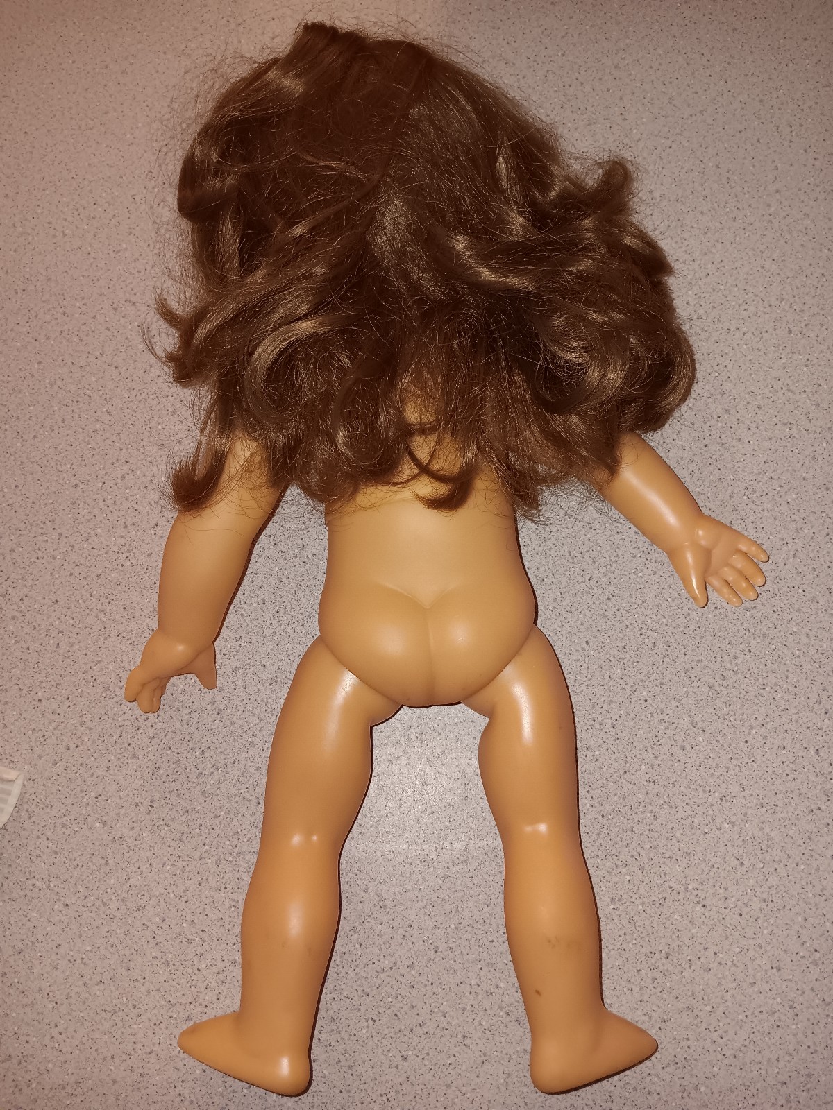 Vintage doll from 1980's, not sure specific year. According to my research, these were made by a German doll company. She is vintage and in good condition for her age. She has a certain energy to her, hard to explain.