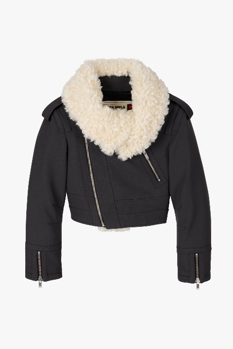 Lapel collar short jacket made of wool blend fabric. Long sleeves with metal zipper and epaulettes. Front zip pocket. Contrasting faux fur appliqué and pronounced topstitching. Front metal zip closure.